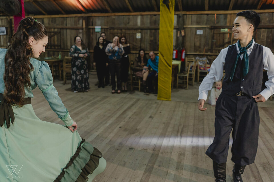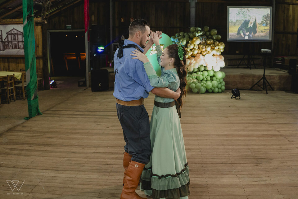 Ana estava deslumbrante, escolheu para debutar um vestido de prenda, uma escolha que reflete sua paixão e respeito pelas tradições. Em vez de sapatos de salto , Ana usou as clássicas sapatilhas de prenda, um detalhe que trouxe ainda mais significado à sua noite especial. O momento mais emocionante foi a valsa com seu pai, que também estava pilchado, reforçando o laço forte e o amor pela cultura gaúcha.