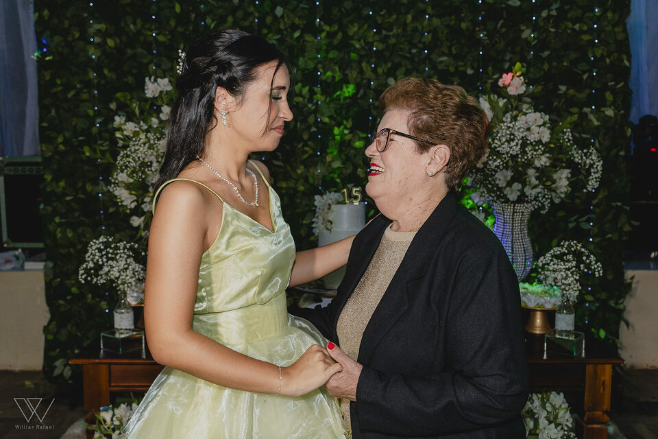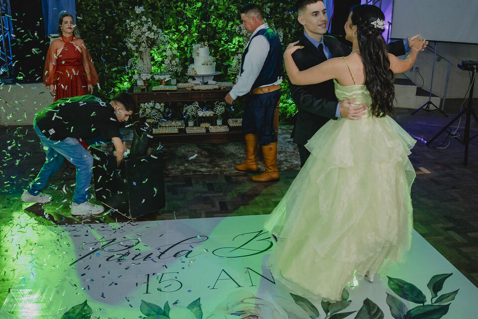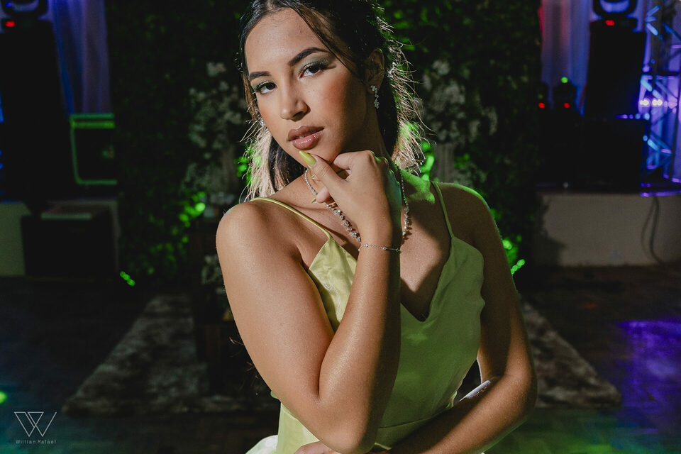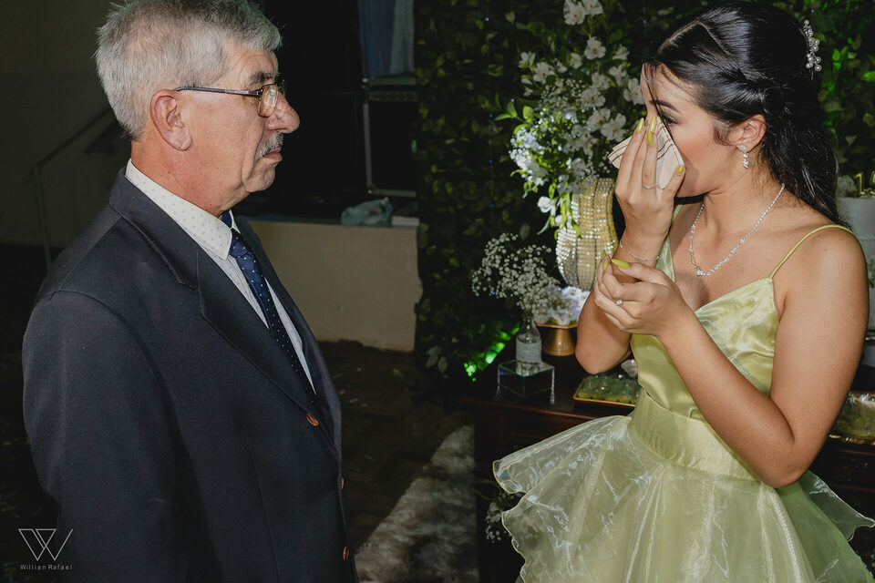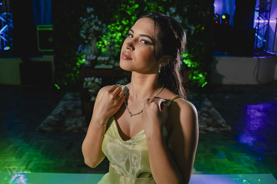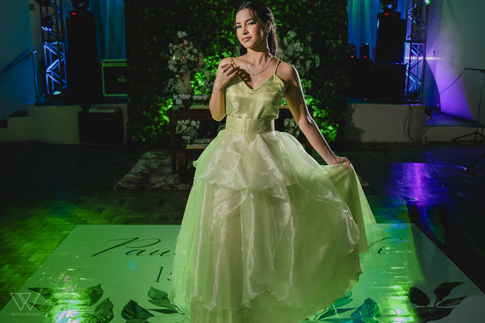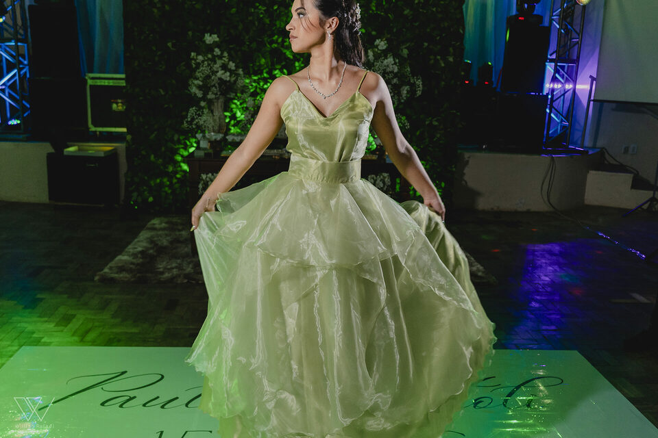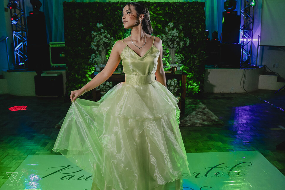Paula estava deslumbrante em um vestido de debutante verde, o vestido, foi confeccionado por pela avó da debutante. Este vestido que foi produzido pelas mãos da avó debutante não apenas realçava sua beleza, mas também simbolizava o carinho e a tradição familiar, certamente que o vestido que foi feito pela avó da debutante tornou a ocasião ainda mais especial.