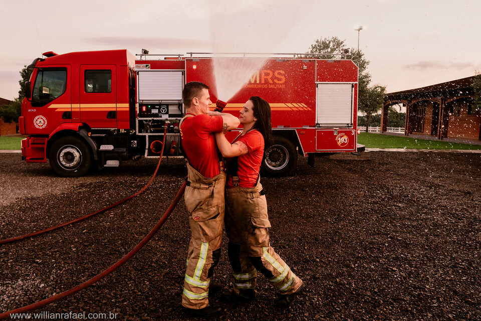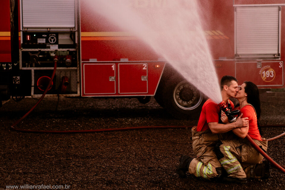 Esse casal de noivos bombeiros me fizeram me emocionar e sentir o amor que um tem pelo outro. Deus nós presenteou com um dia incrível e para finalizar o pré casamento, nada melhor que o carro de bombeiro fazer parte das fotos do ensaio de pré casamento desse casal. Água para lavar o vestido da noiva, ou melhor a farda da noiva e nós preparar para um grande casamento que está por vir!