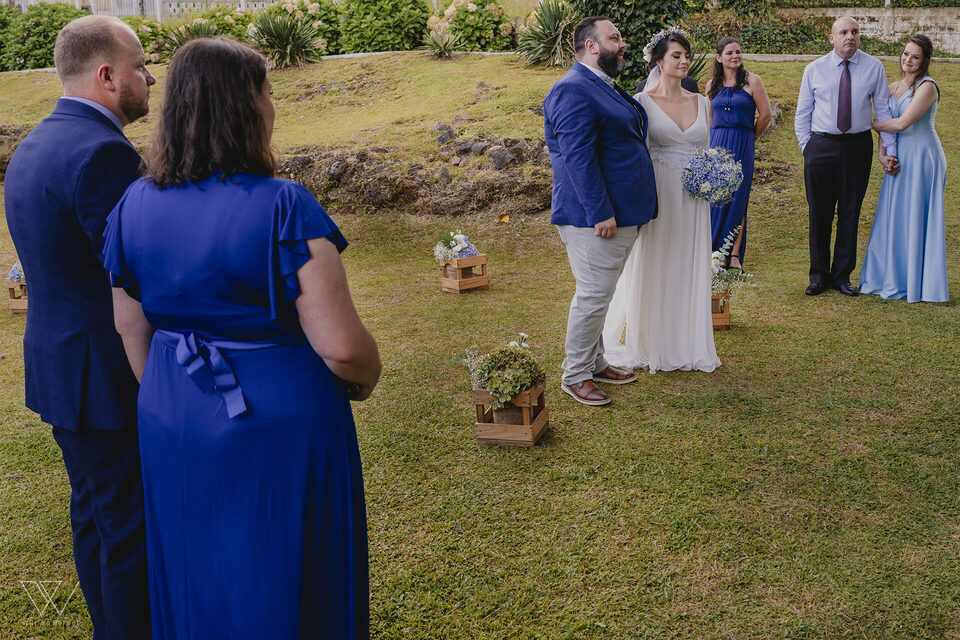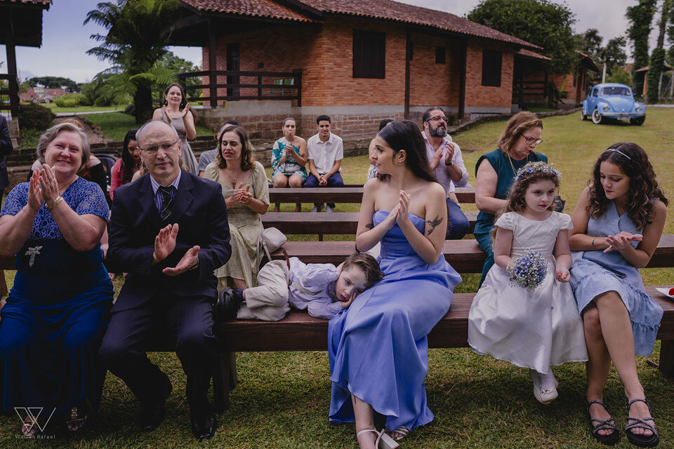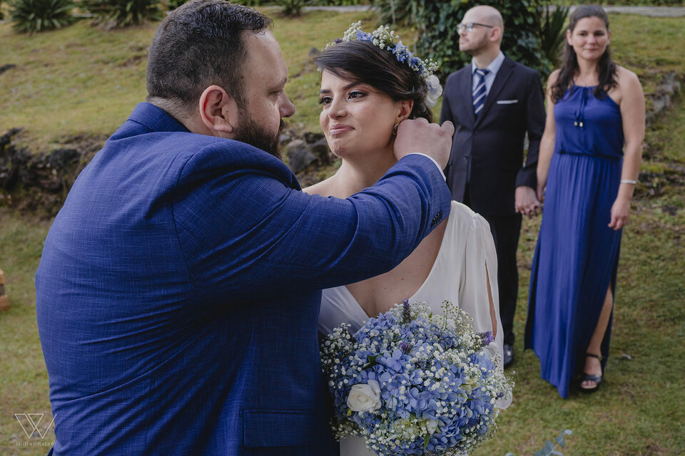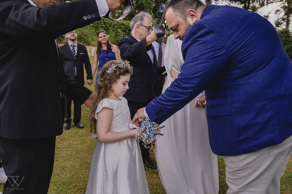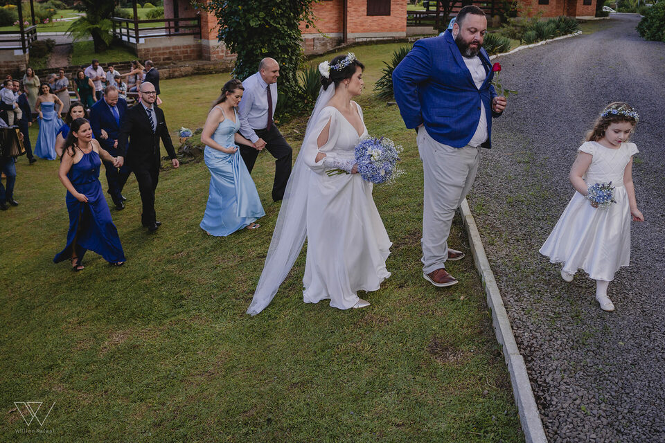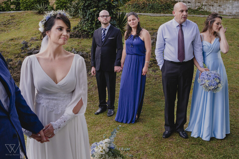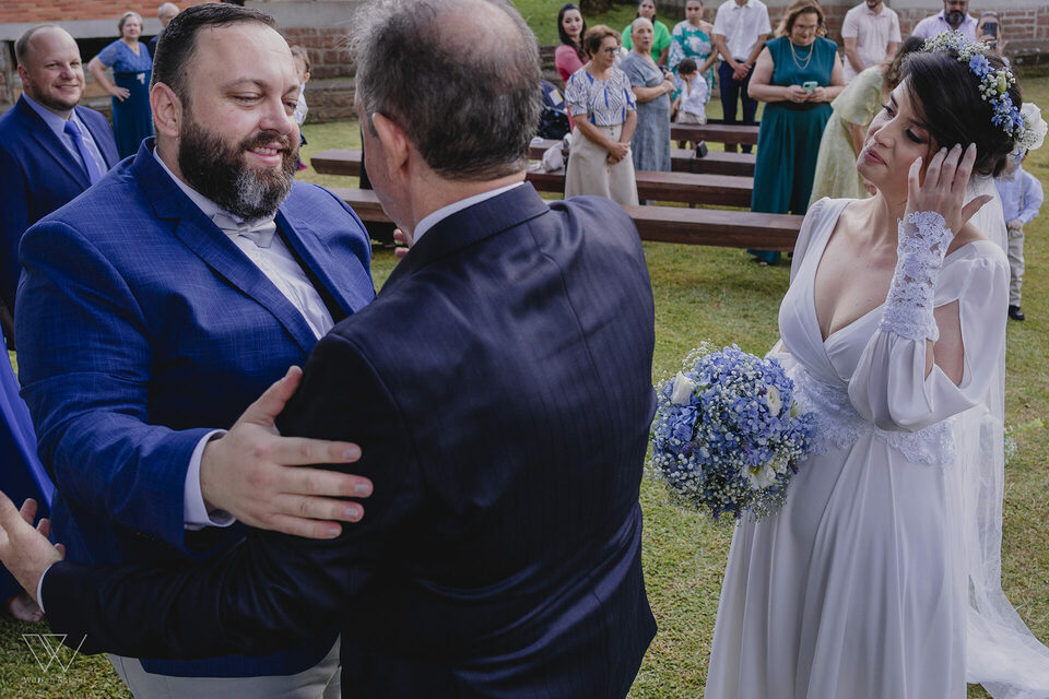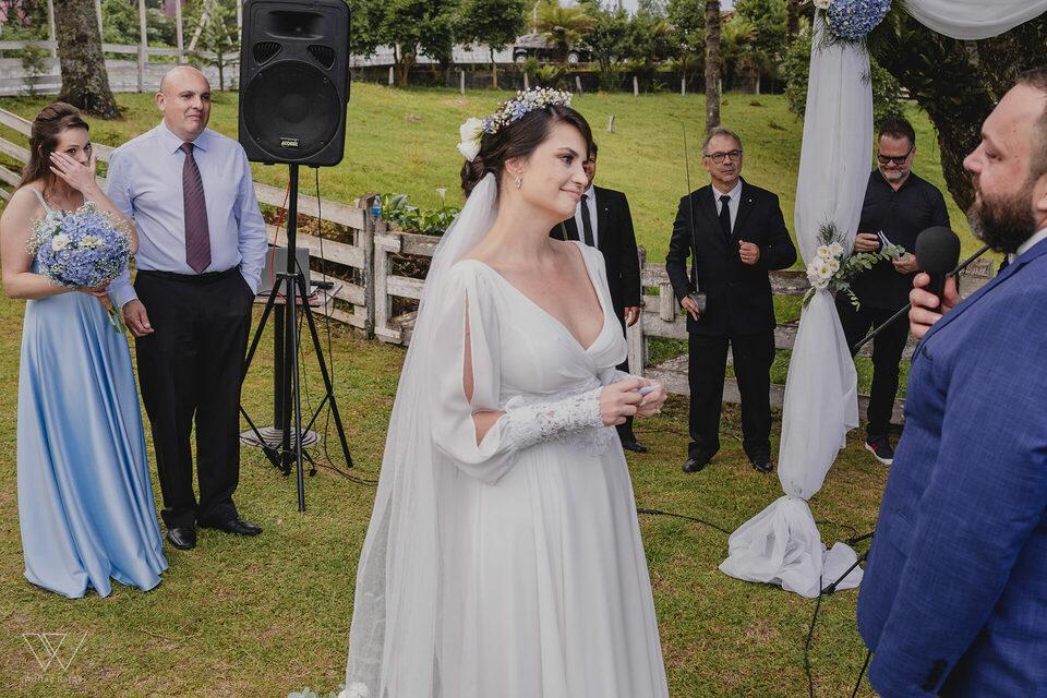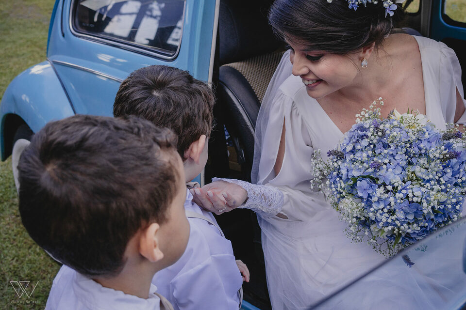 As madrinhas de honra, vestidas com tons azuis que refletiam o céu daquela tarde, adicionaram um toque de elegância celestial à cerimônia de casamento. Cada detalhe, desde as flores colhidas pelas madrinhas da noiva pela cidade até a coroa de flores do campo que adornava a noiva, contribuiu para criar uma atmosfera de conto de fadas do casamento.