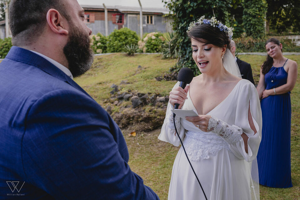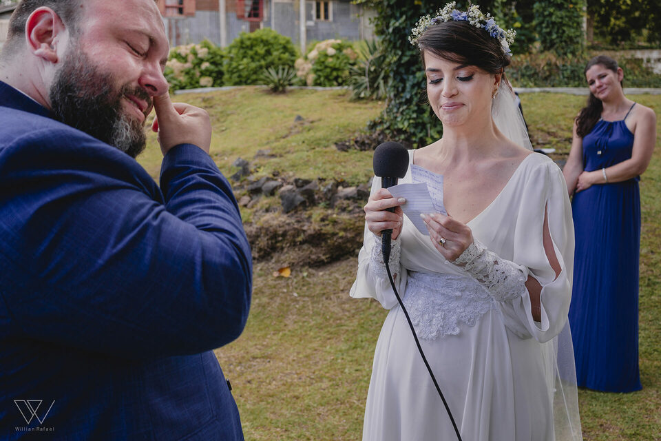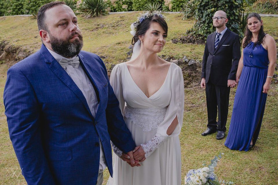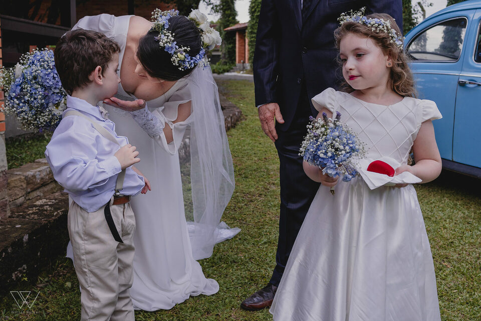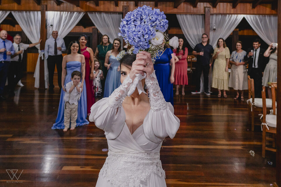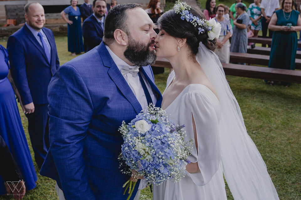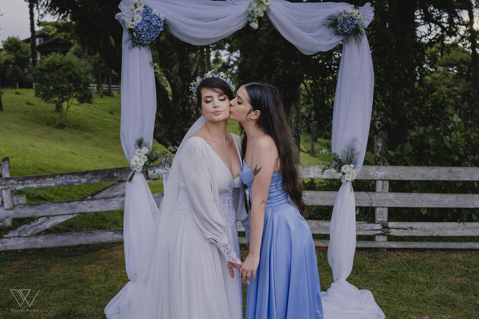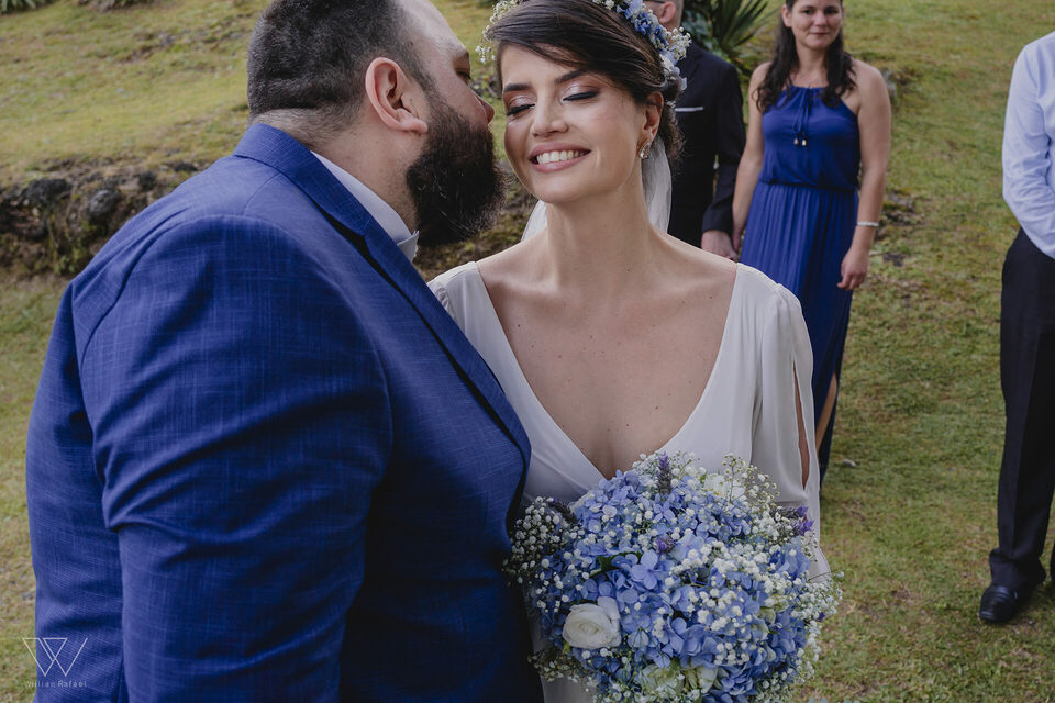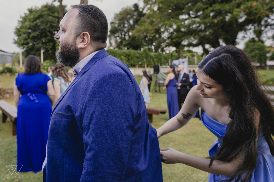As madrinhas de honra, vestidas com tons azuis que refletiam o céu daquela tarde, adicionaram um toque de elegância celestial à cerimônia de casamento. Cada detalhe, desde as flores colhidas pelas madrinhas da noiva pela cidade até a coroa de flores do campo que adornava a noiva, contribuiu para criar uma atmosfera de conto de fadas do casamento.