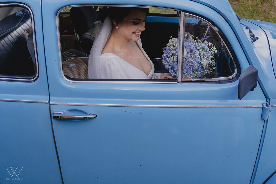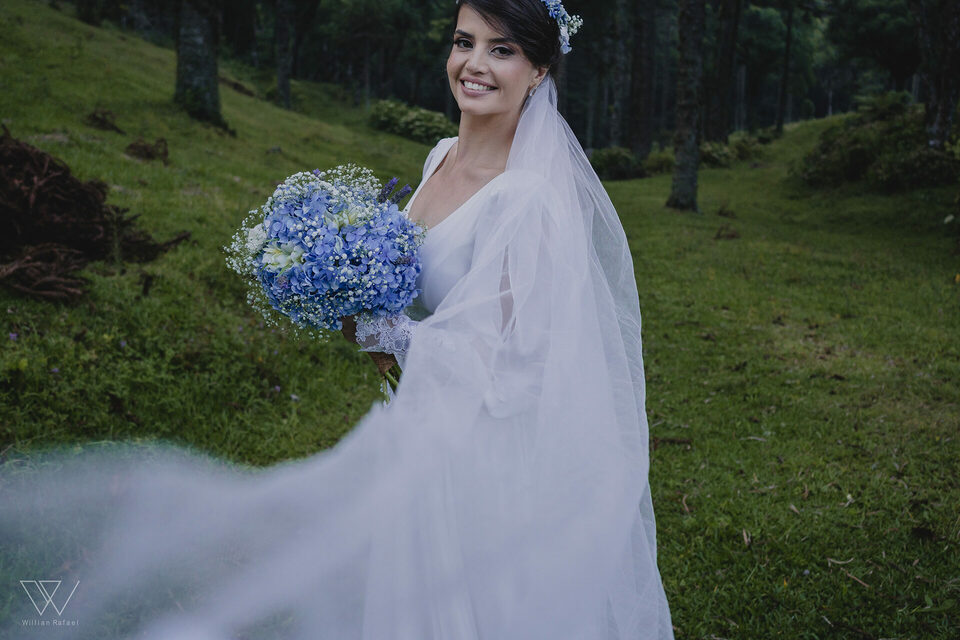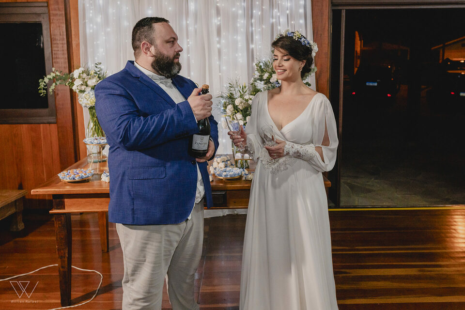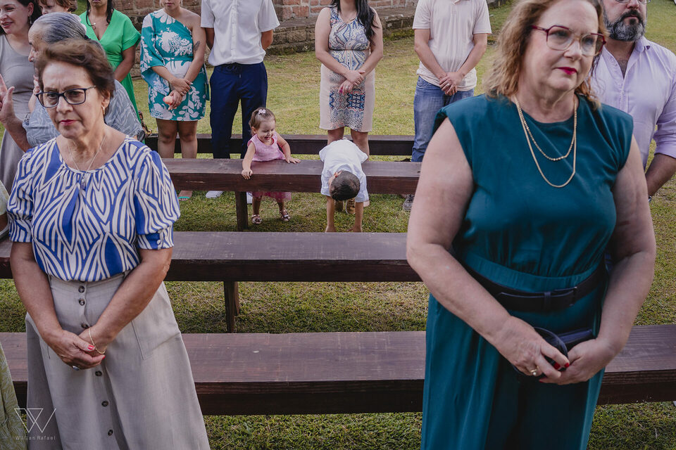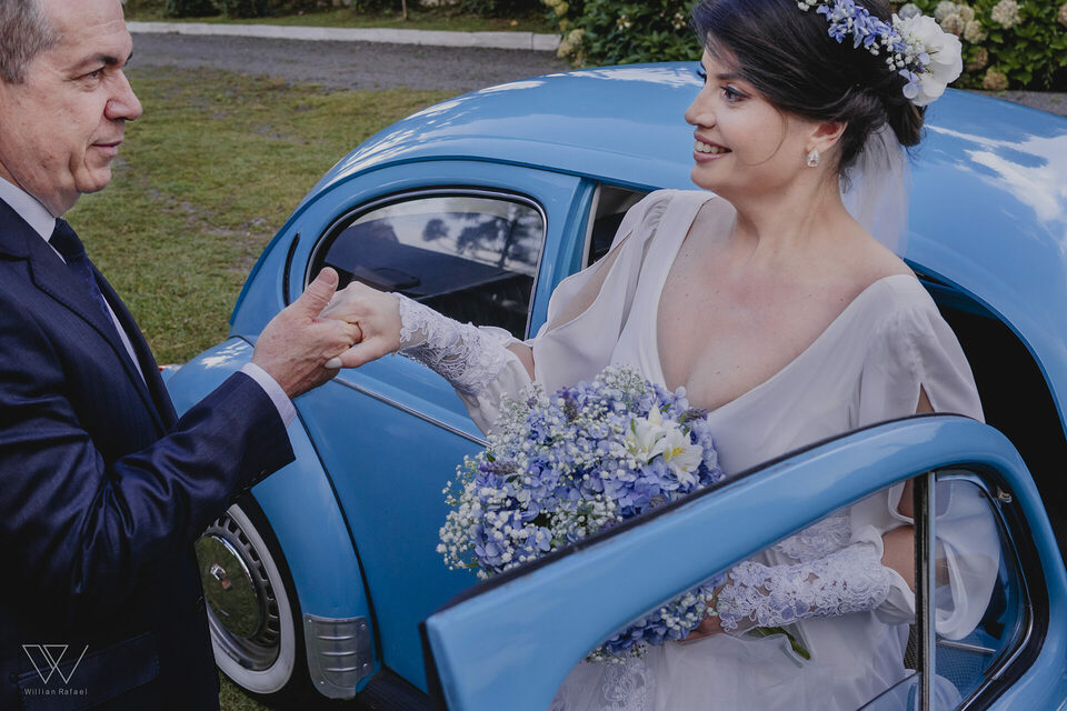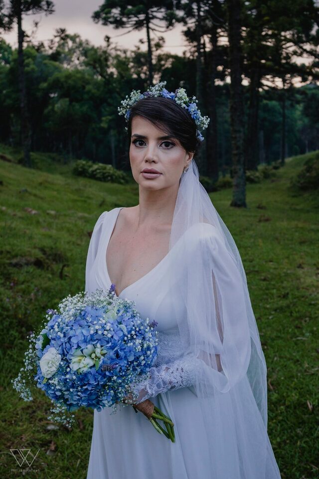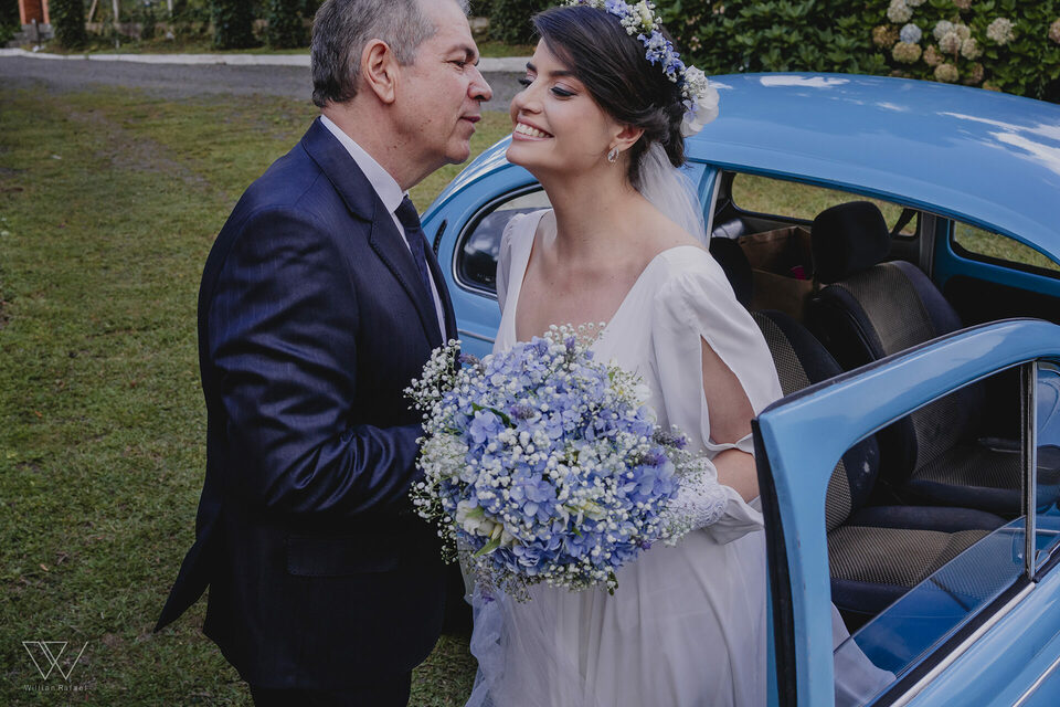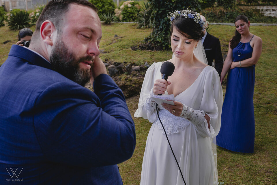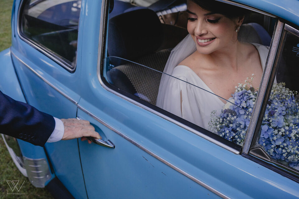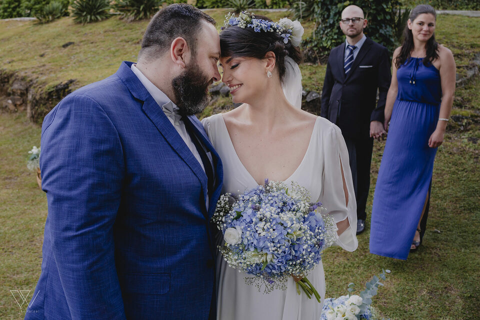 As madrinhas de honra, vestidas com tons azuis que refletiam o céu daquela tarde, adicionaram um toque de elegância celestial à cerimônia de casamento. Cada detalhe, desde as flores colhidas pelas madrinhas da noiva pela cidade até a coroa de flores do campo que adornava a noiva, contribuiu para criar uma atmosfera de conto de fadas do casamento.