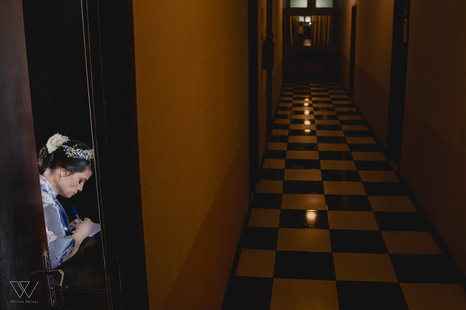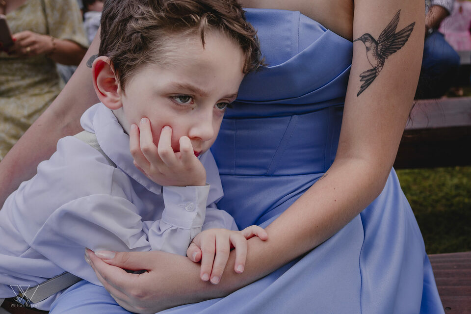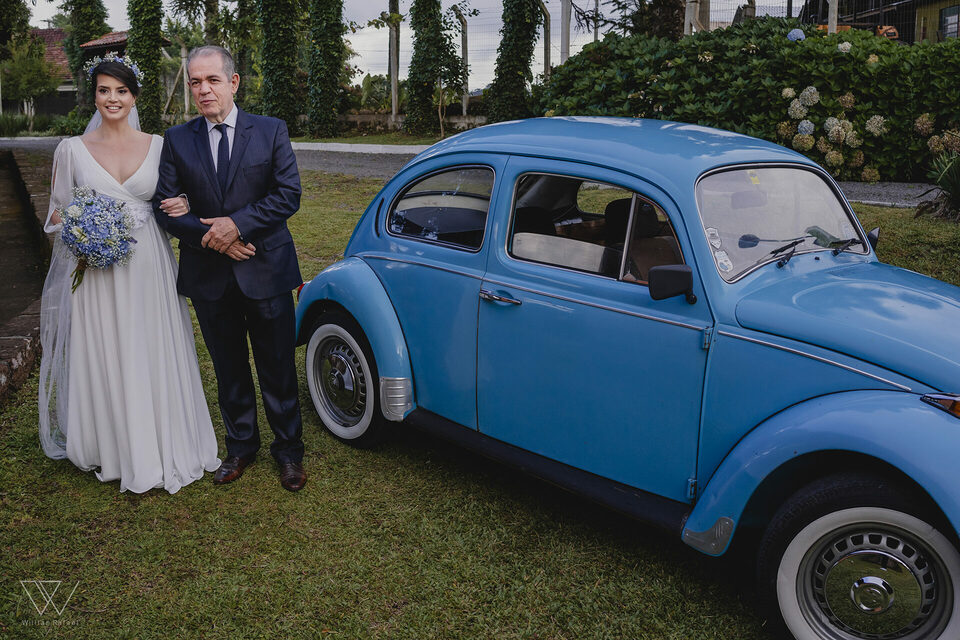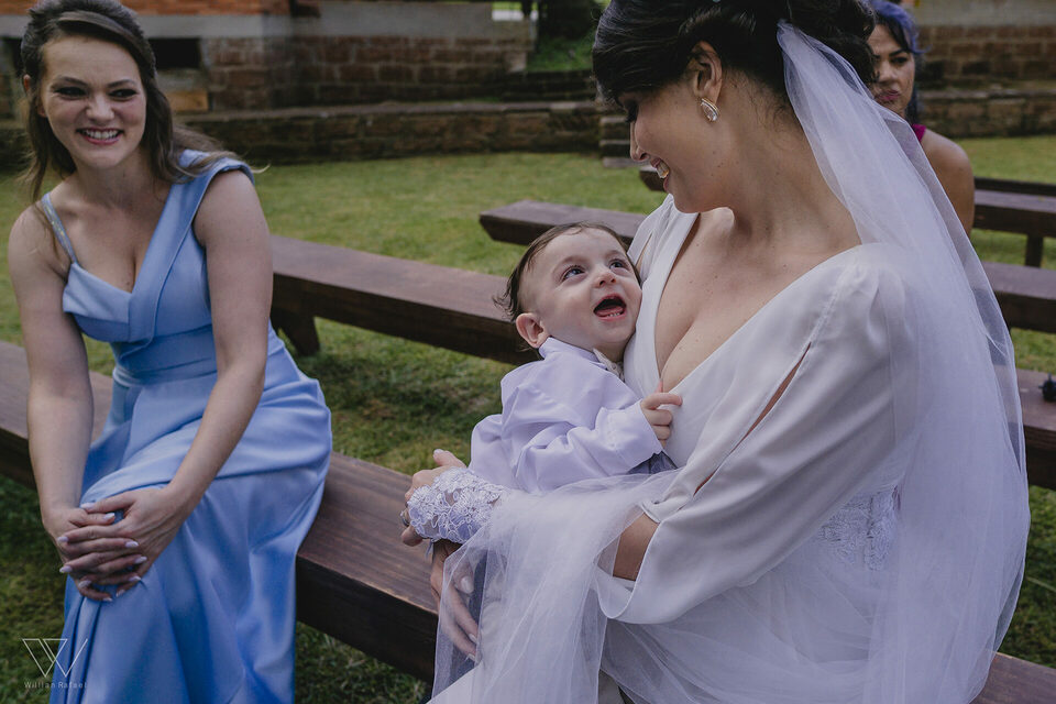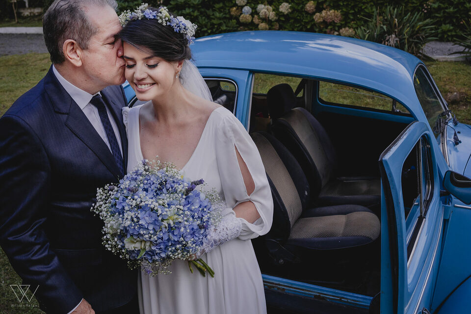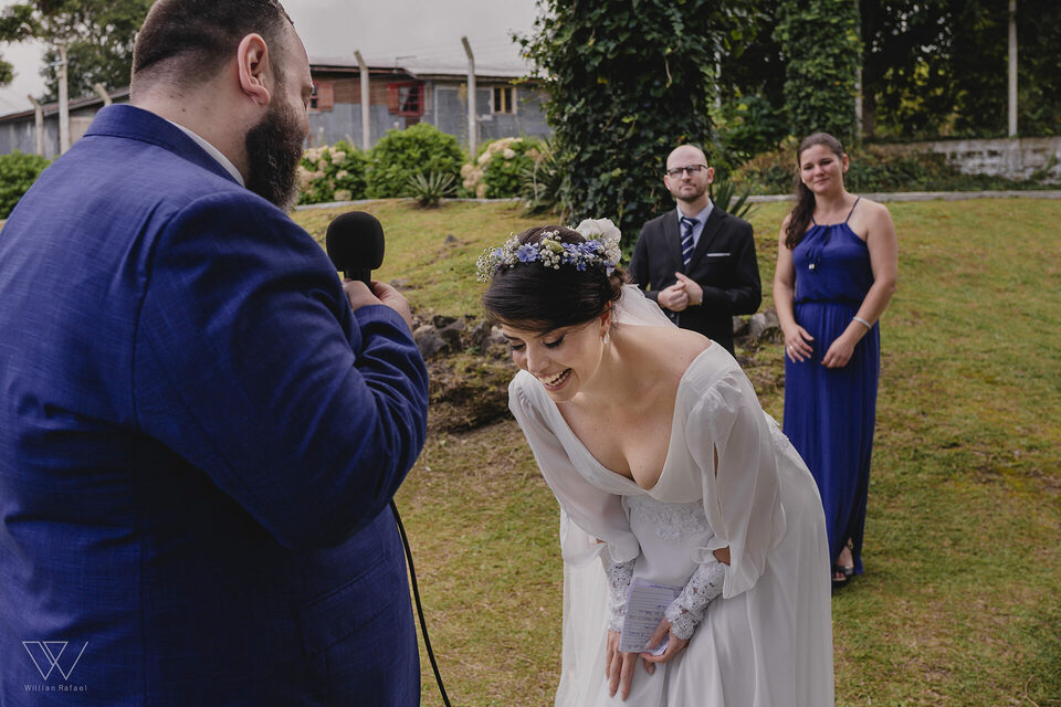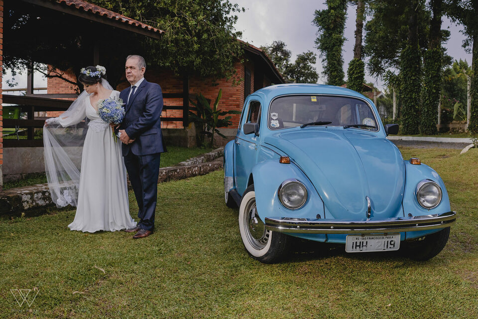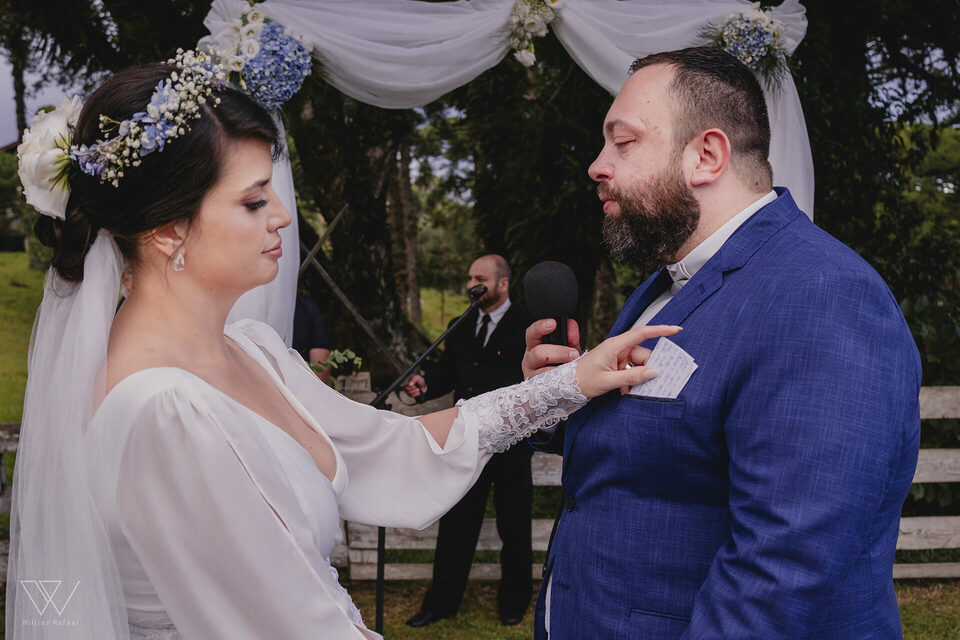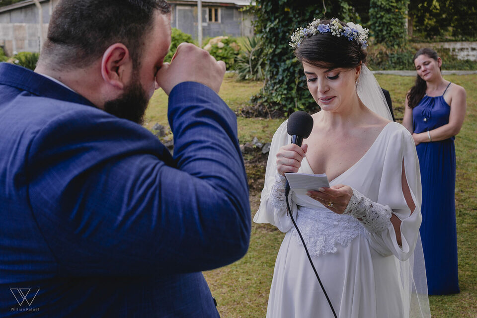 As madrinhas de honra, vestidas com tons azuis que refletiam o céu daquela tarde, adicionaram um toque de elegância celestial à cerimônia de casamento. Cada detalhe, desde as flores colhidas pelas madrinhas da noiva pela cidade até a coroa de flores do campo que adornava a noiva, contribuiu para criar uma atmosfera de conto de fadas do casamento.