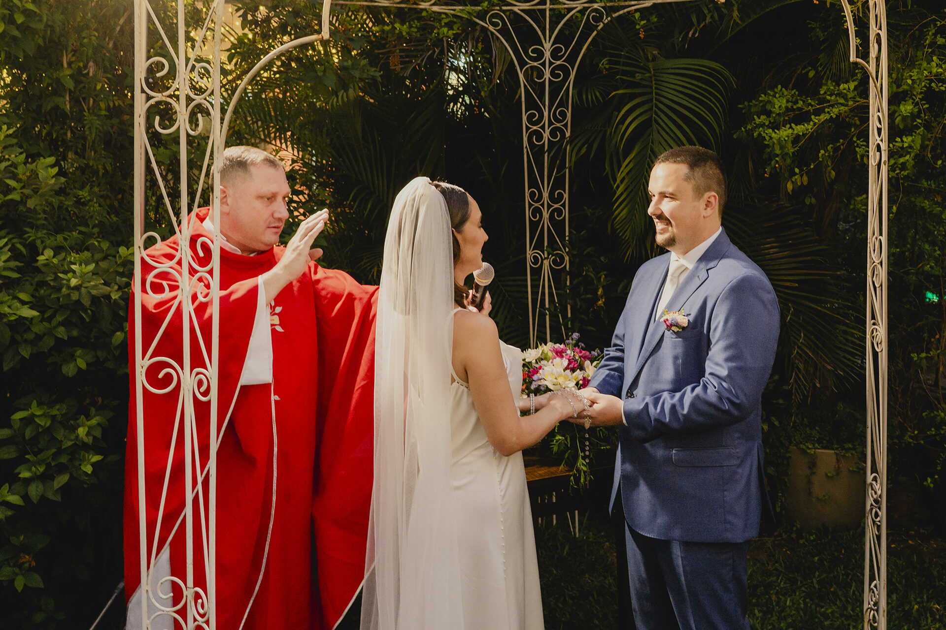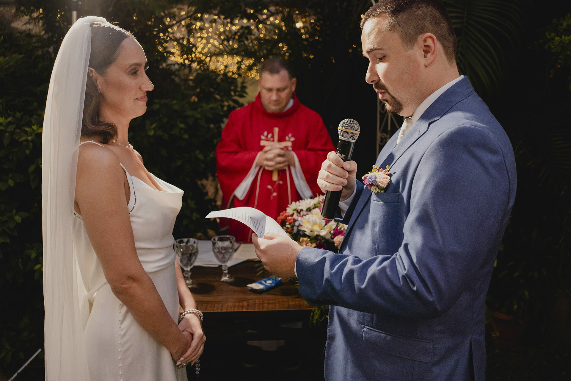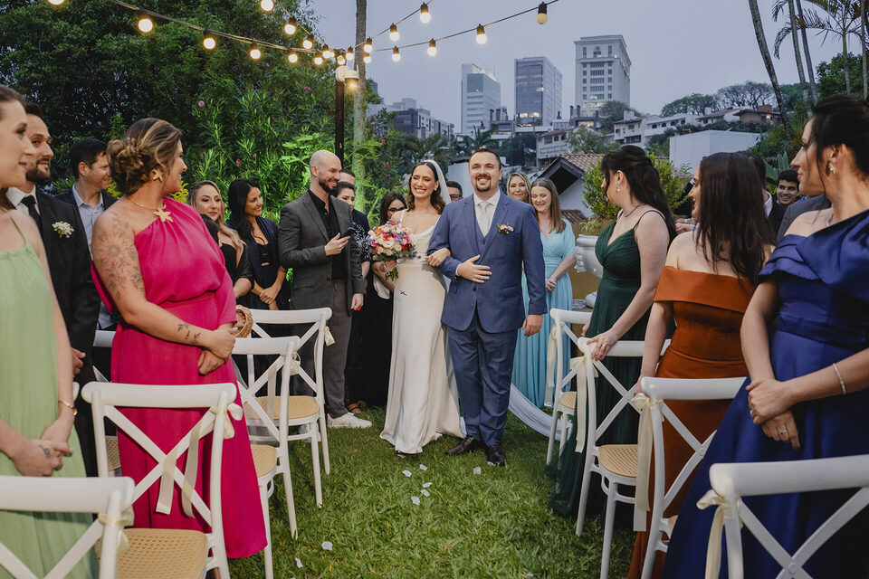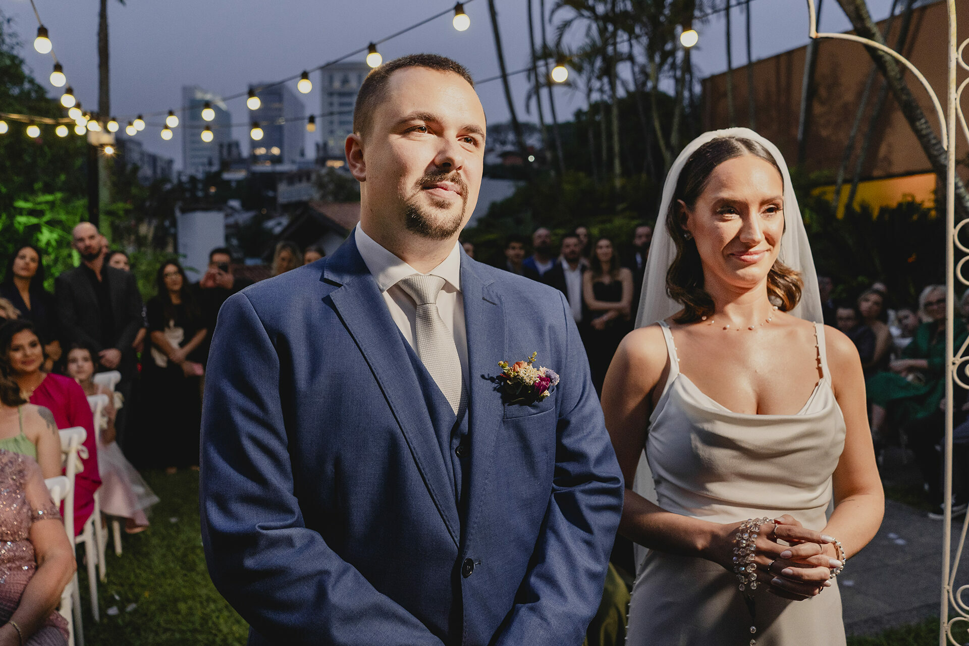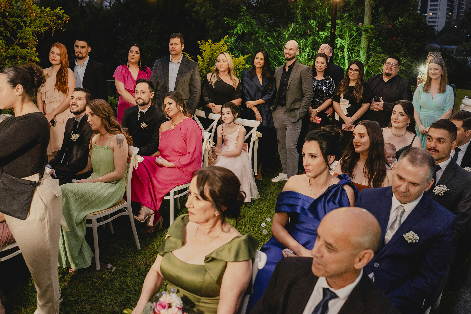 A cerimônia seguiu leve, cheia de carinho e conexão. A atmosfera do Gui Olivier, com seu jardim acolhedor e sua arquitetura aconchegante, trouxe um cenário ideal para quem busca um casamento ao ar livre em Porto Alegre com uma estética natural e elegante.