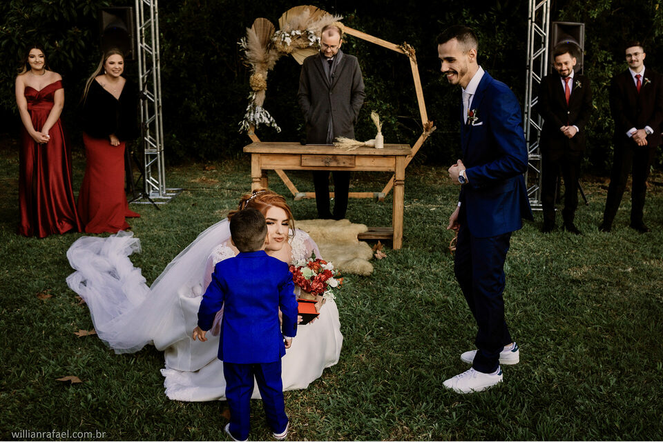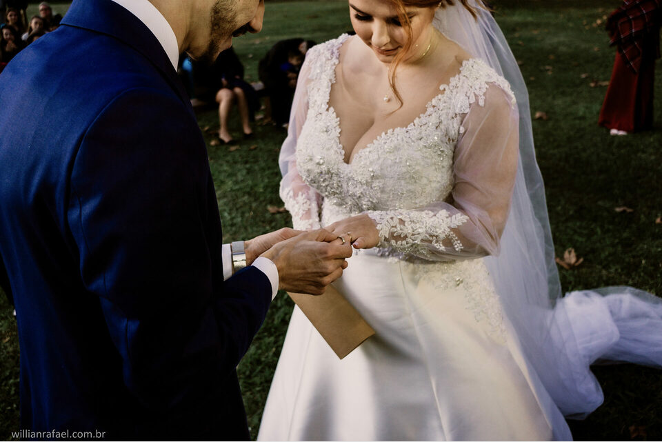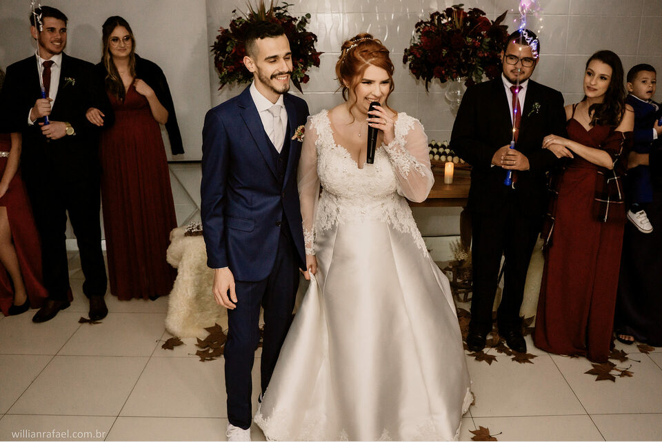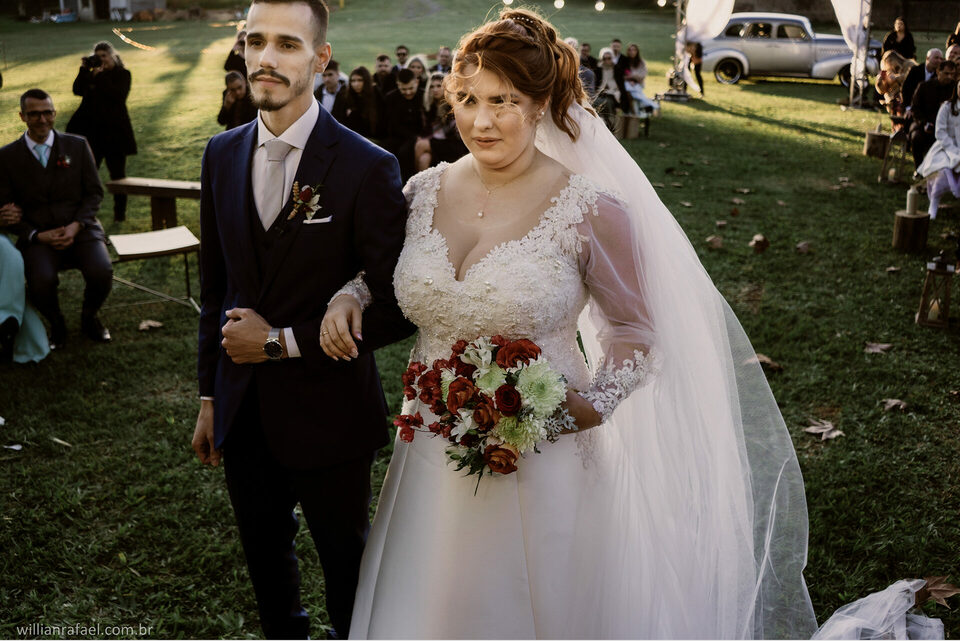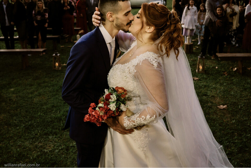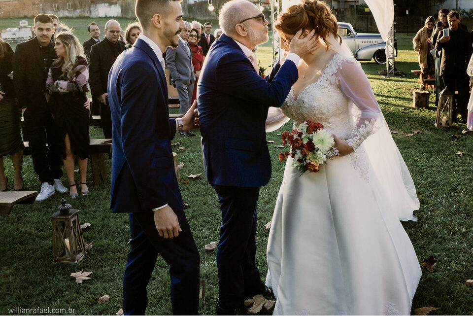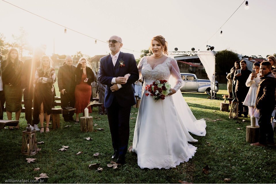 E como falei antes no início desse texto quem aqui não sonha em casar ao fim de tarde? Ver aquele sol se pondo junto com o beijo do sim do casamento? Folhas caindo afinal casar no inverno tem seus charmes e esses momento são todos especiais. Este era o sonho da noiva Manu e do Gabi, casar ao fim de tarde de um inverno e todos nós sabemos o quanto é charmoso nosso inverno aqui no Sul. Esse era o desejo da Manu ver o Gabi La na frente do altar o sol se pondo a noiva sendo conduzida com seu pai até o seu noivo com as folhas rolando no caminho e foi tudo tão perfeito.