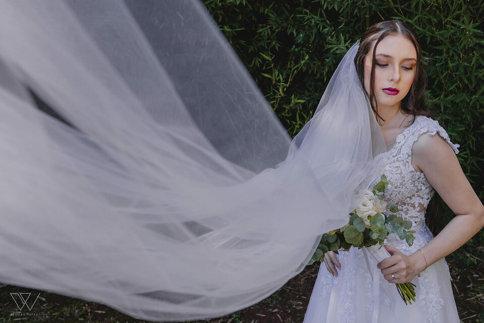 O vestido de noiva de Andrielen era deslumbrante, realçando sua beleza natural e iluminando ainda mais o ambiente ensolarado.