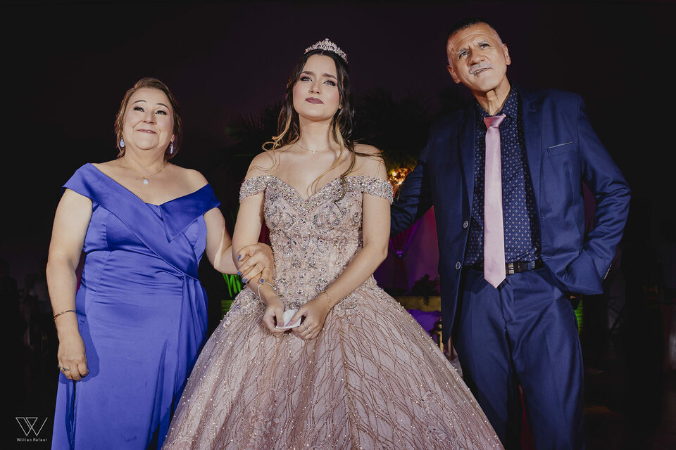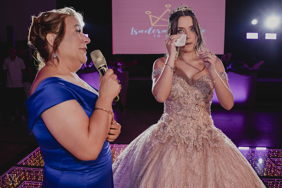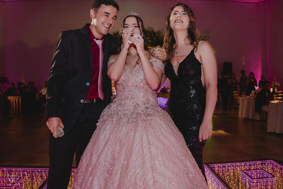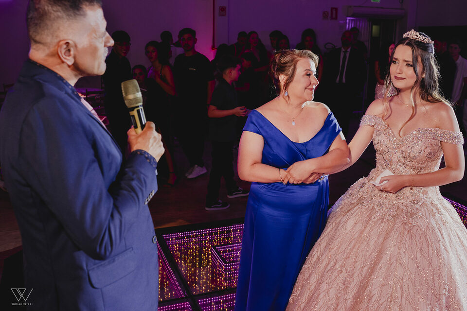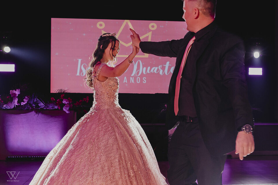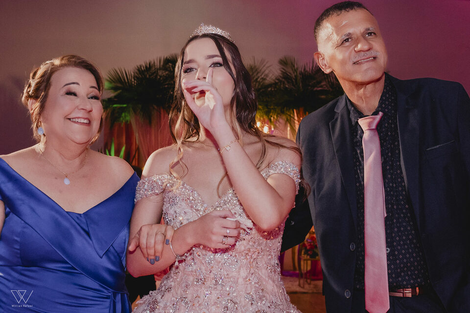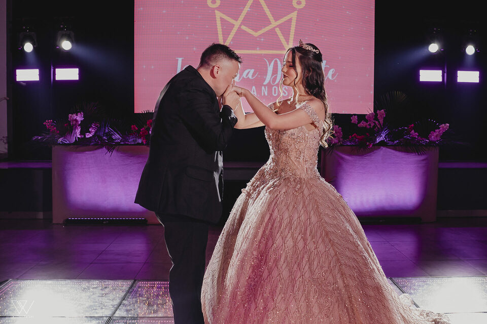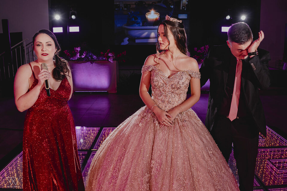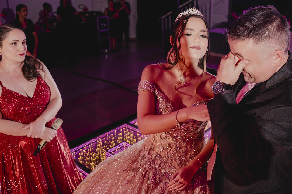 A decoração em tons de rosa trouxe um toque romântico ao salão, criando um cenário mágico para esse dia tão especial. Logo no início da festa, os olhares se voltaram para Isadora, que fez sua grande entrada com um sorriso radiante, iluminando o ambiente. O momento mais emocionante aconteceu durante a primeira valsa, quando ela dançou com seu pai, Diego, que não conteve as lágrimas ao segurar a filha nos braços. E como se a emoção não fosse suficiente, os avós prepararam uma homenagem emocionante, relembrando momentos marcantes da vida da debutante e arrancando lágrimas de felicidade de todos os presentes.