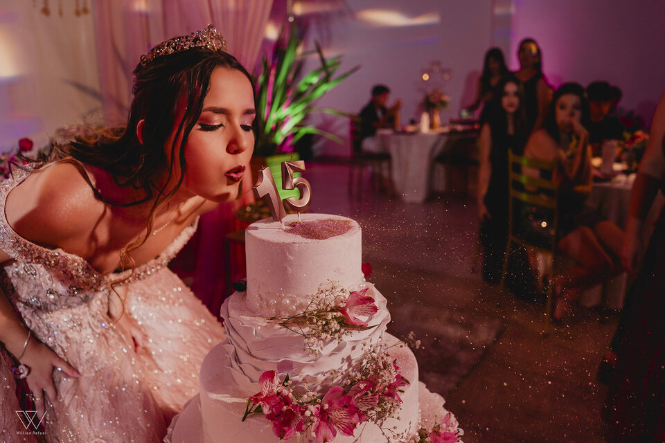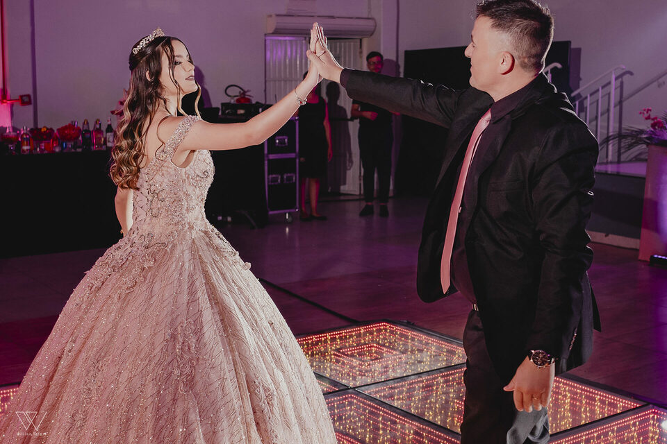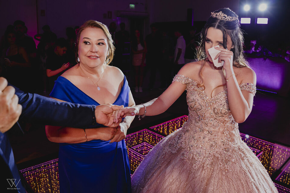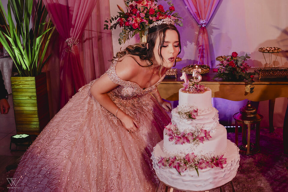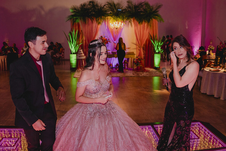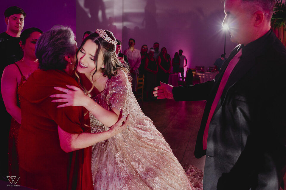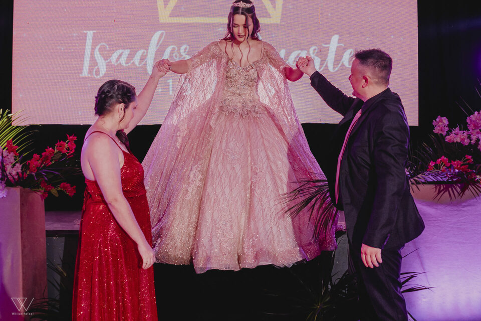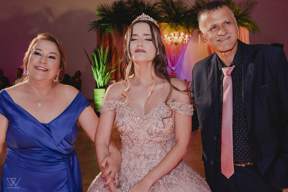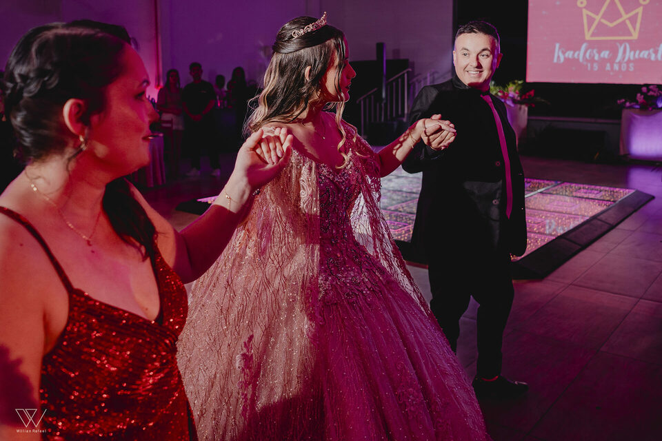 A decoração em tons de rosa trouxe um toque romântico ao salão, criando um cenário mágico para esse dia tão especial. Logo no início da festa, os olhares se voltaram para Isadora, que fez sua grande entrada com um sorriso radiante, iluminando o ambiente. O momento mais emocionante aconteceu durante a primeira valsa, quando ela dançou com seu pai, Diego, que não conteve as lágrimas ao segurar a filha nos braços. E como se a emoção não fosse suficiente, os avós prepararam uma homenagem emocionante, relembrando momentos marcantes da vida da debutante e arrancando lágrimas de felicidade de todos os presentes.