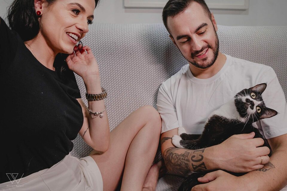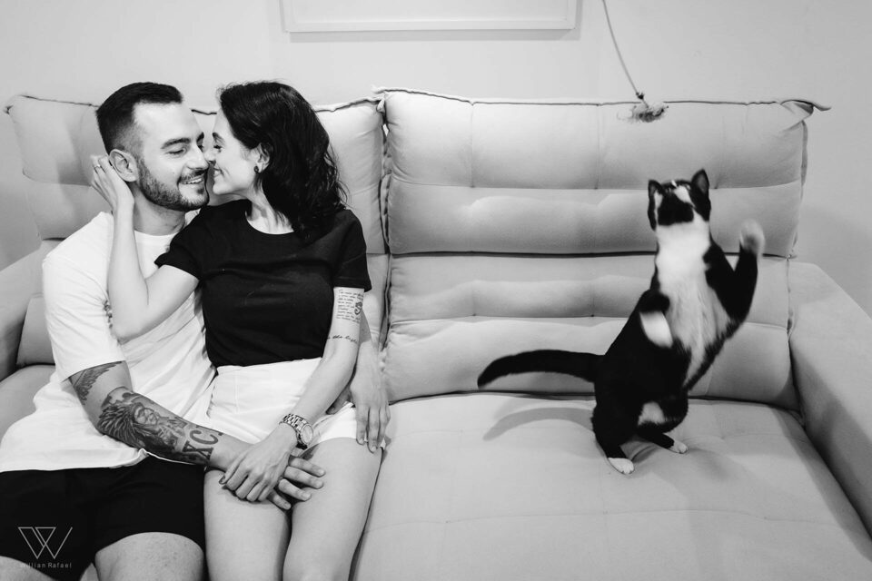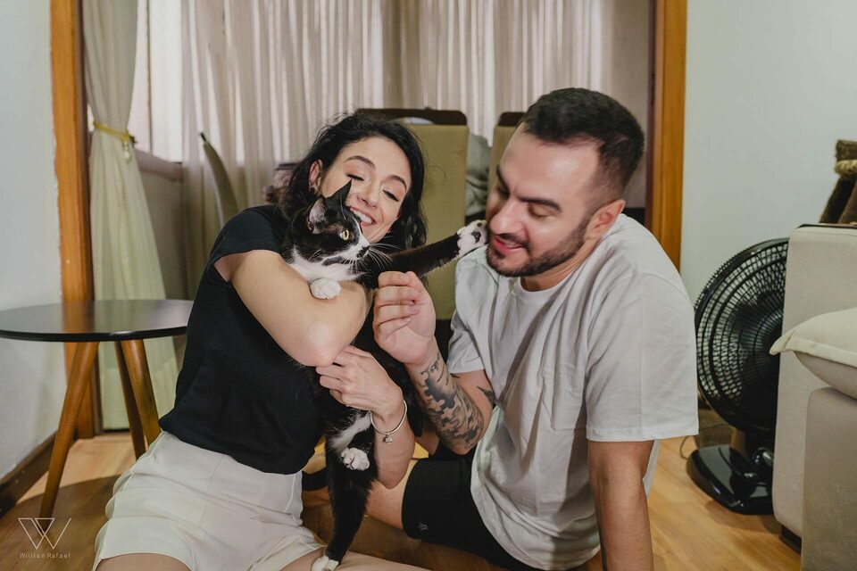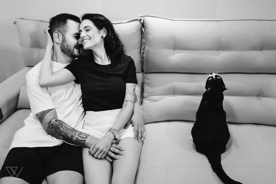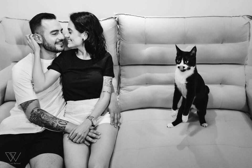 Mas não para por aí! O segundo capítulo dessa jornada de amor nos leva ao aconchego do lar, à doce atmosfera da casa que Magali e Leo chamam de lar. Entre risos, abraços e o ronronar da gatinha Vilma, que não perdeu a oportunidade de participar do ensaio, eles construíram um ninho de amor onde cada detalhe conta a história de sua cumplicidade e afeto.